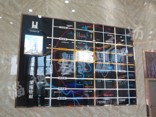 区位模型主要以有机玻璃的形式体现,贯穿项目的主要干道采用跑马流水的灯光效果体现,本案位置以突出LOGO的形式体现并配有灯光效果,整体区位模型配有多路开关遥控器可远程操作灯光的开关,方便销售人员与客户介绍时区位与解说同步进行。